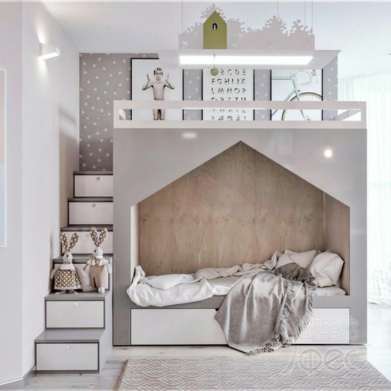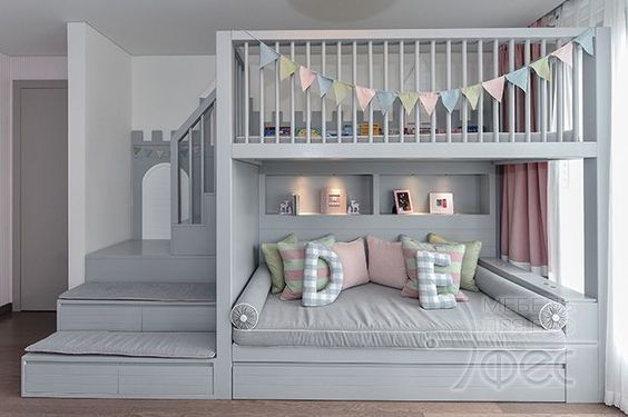 Чтобы соблюсти эргономичность пространства, комнаты обустраиваются разнообразными вариантами двухэтажных кроватей.